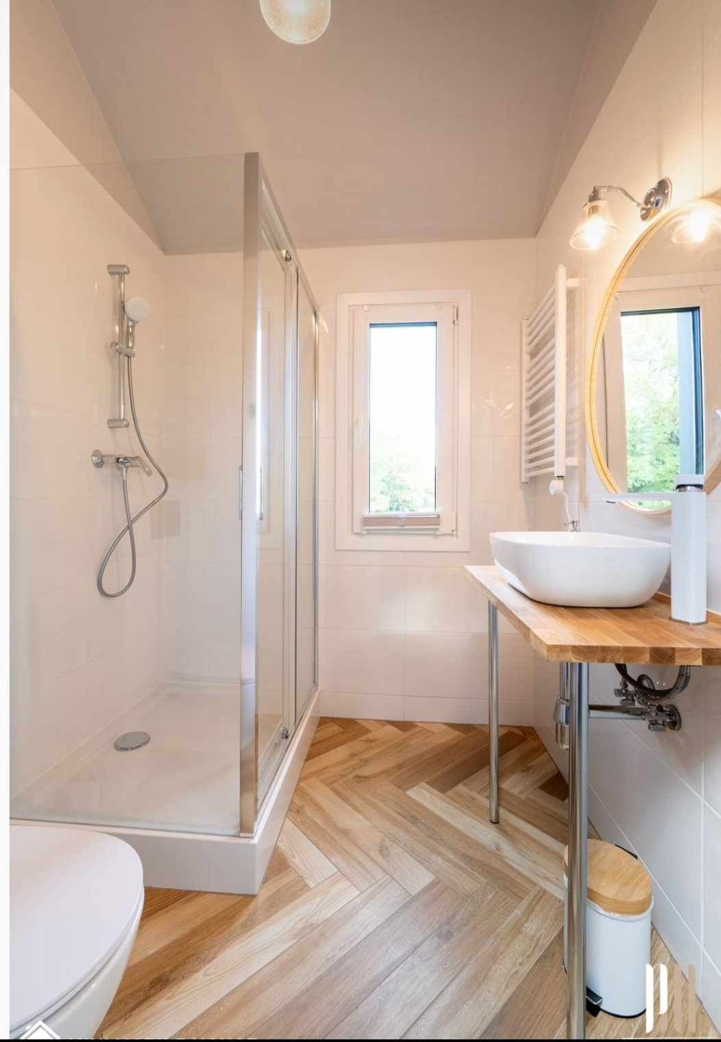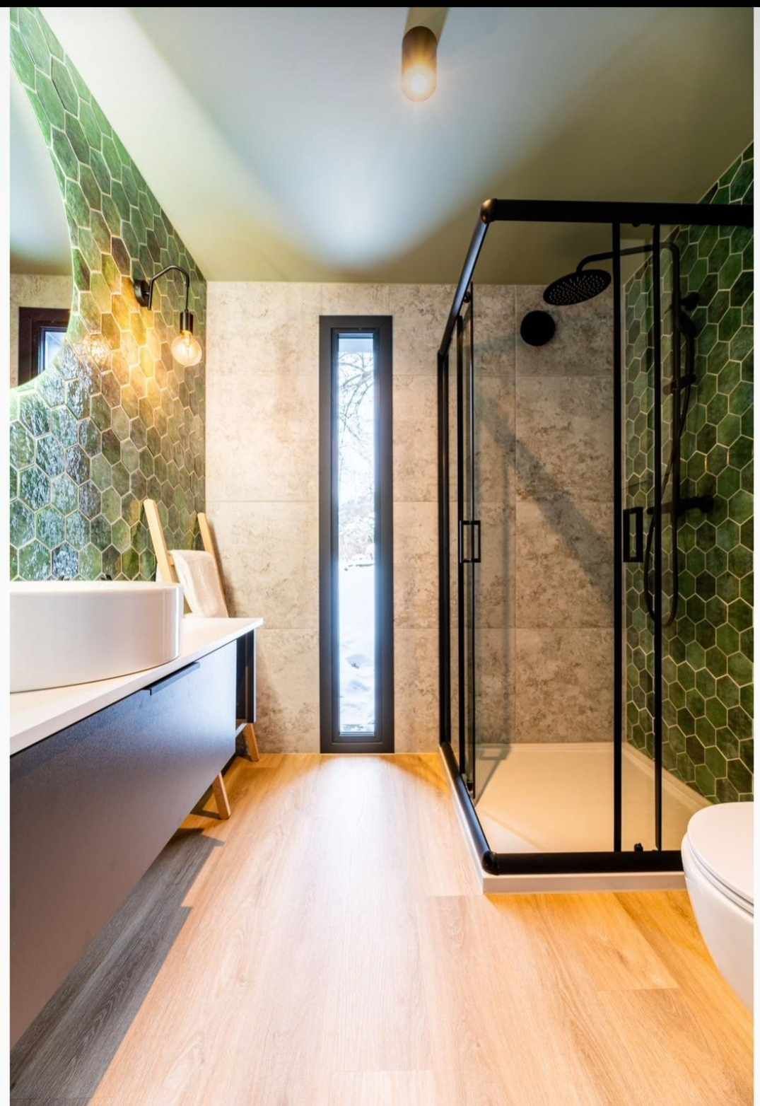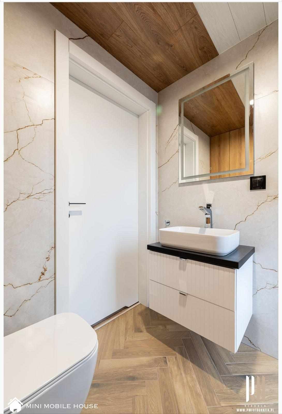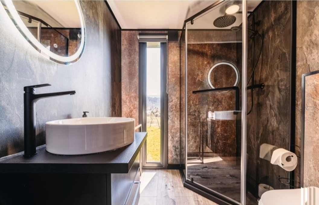 Installation von SPC-Fliesen und Vinylplatten, Waschtisch, Toilette, Duschkabine mit Regendusche, Waschbecken mit Wasserhahn.